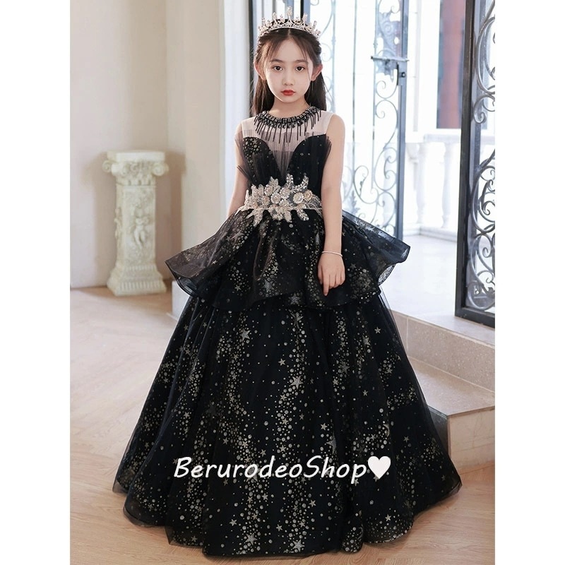 <特価>子供ドレス 黒 ピアノ発表会ドレス ロングドレス 星柄 ビーズ フリンジ キレイめ 演奏会ドレス ブラック 女児ドレス シャンパン色 女の子ドレス キッズドレス フレア 高級感 豪華 100~160c