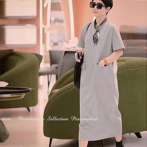 お値下げしましたストレートロングワンピース 上品スタイル グレーワンピース 半袖 ダブルポケット 女子会細く見える通勤通学20代30代40代50代60代