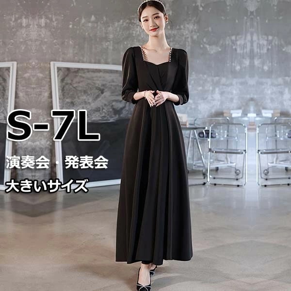 ドレス 大人 ピアノ 発表会 黒ドレス 無地 スイートハートネック エレガント イブニングドレス パーティードレス ロングドレス 母親 結婚式 演奏会 袖あり ドレス 成人式 同窓会 ピアノ発表会 A