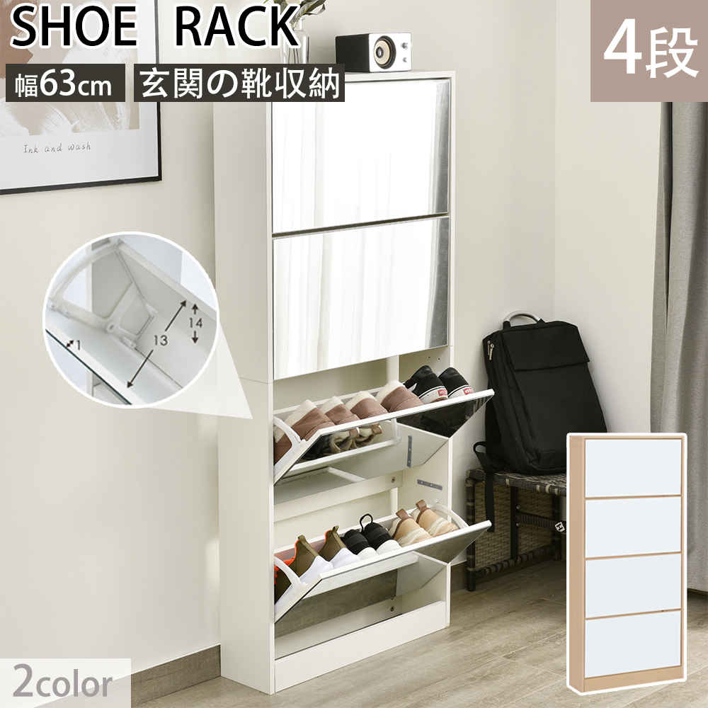 新着商品超人気 【新品】 薄型 4段 シューズラック スリム シューズボックス 靴箱 下駄箱 ミラー 全身鏡 玄関収納 消臭 大容量 木製 姿見 スリム ナチュラル ホワイト くつ箱 靴入れ 収納ラック エン