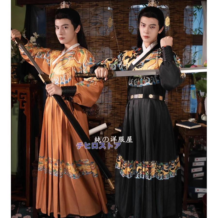 【2024経典】【激安販売】大人 中華コスプレ衣装 メンズ レディース 中国古代服装 明朝 侠客 禁衛軍 剣士 コスチューム 龍プリント 交差襟 ロング丈 一式ブラウス 着脱やすい パンツセ