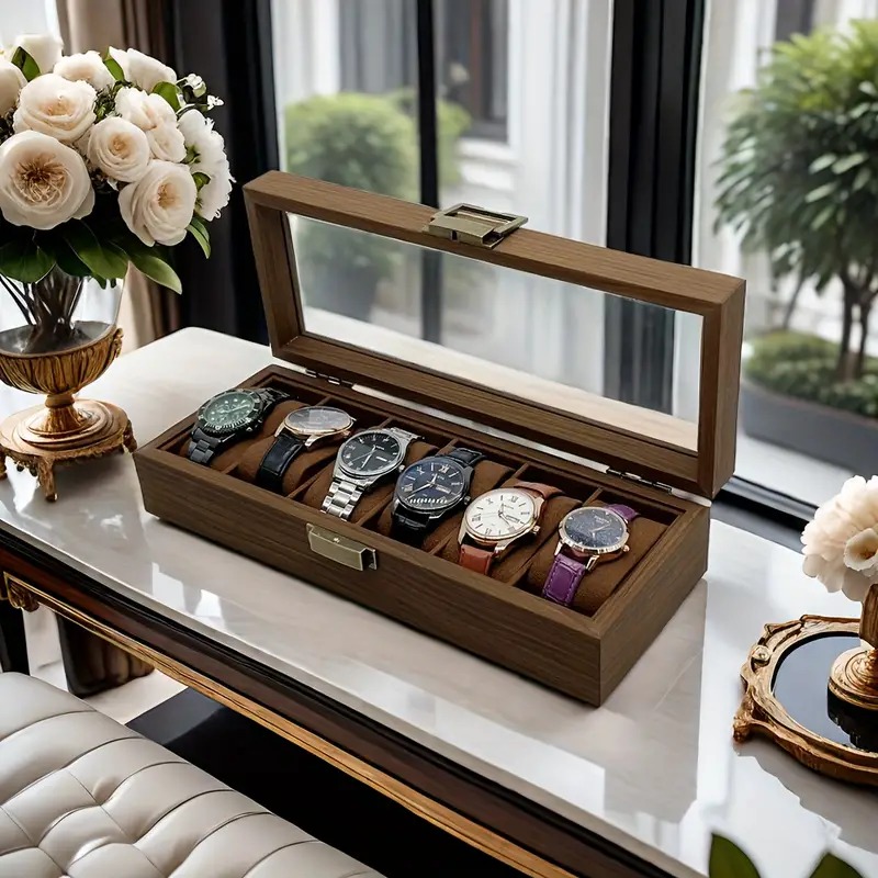 【おまけ付】腕時計収納ボックス 腕時計を保管 展示 6スロット 木製 ブラウン 腕時計 ナチュラル お洒落 ウッド 木目 アンティーク調 インテリア 4-7